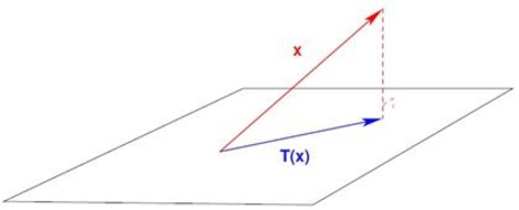 In this image, the dotted red line represents the error vector between and its projection on the subspace. Note that the projection of and the error vector are orthogonal to each other.